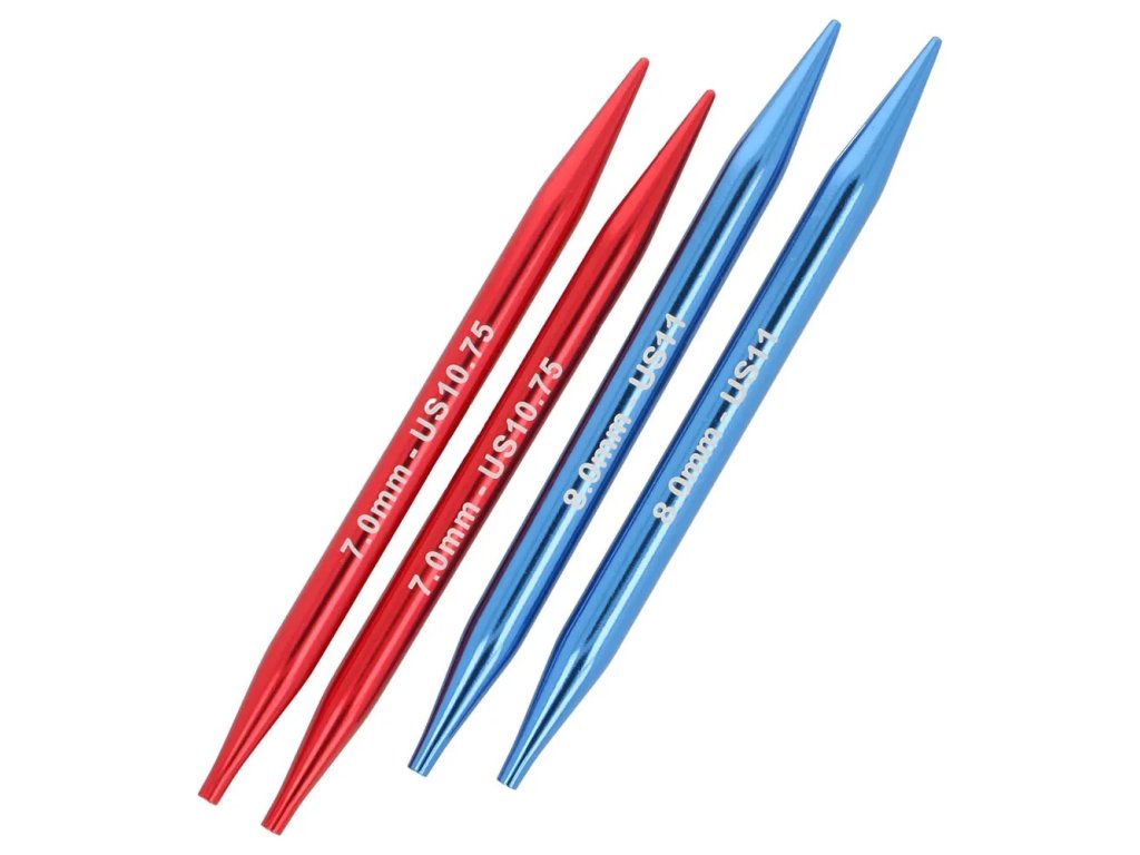 8 × párů jehlic délky 13 cm v následujících průměrech: 3,50 mm, 4,00 mm, 4,50 mm, 5,00 mm, 5,50 mm, 6,00 mm, 7,00 mm, 8,00 mm